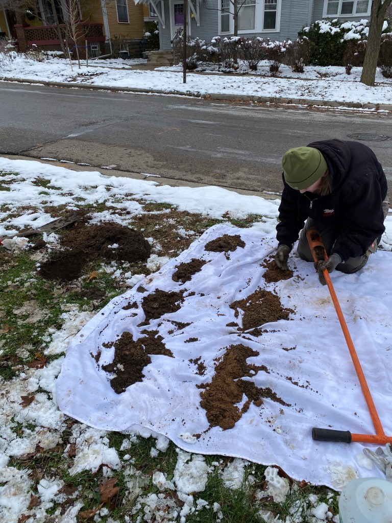 Doing garden work isn’t the first thing that comes to mind in winter months, but that is precisely what happened on Hope St. between Carlton and Benjamin! There’s a lot of planning and prep work that needs to be done before a curb-cut rain garden goes in, and folks were out in the watershed doing just that in the snow of December. Pictured below, soil borings are being examined to ensure the location of the potential rain garden has the appropriate drainage required.